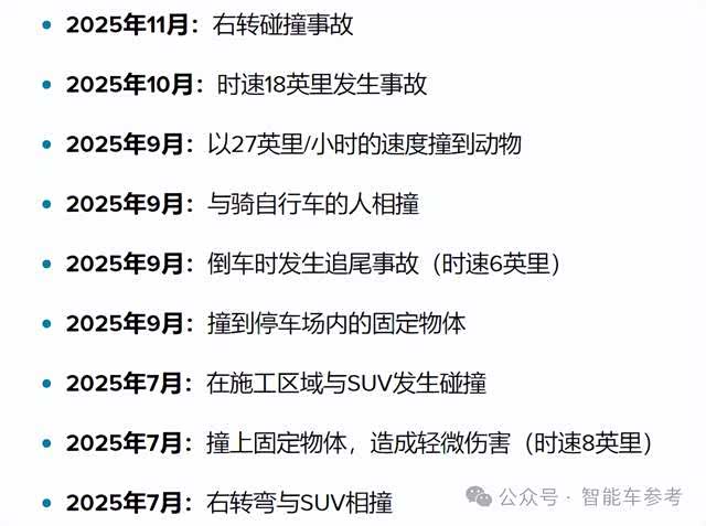 据electrek报道,NHTSA同样对特斯拉进行了调查,发现在2025年7月~11月之间,特斯拉已经在得州报告了9起Robotaxi事故: