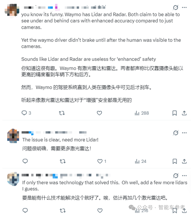 更有人对此事故疑惑,激光雷达或雷达看起来并没有起到作用,应该加装更多: