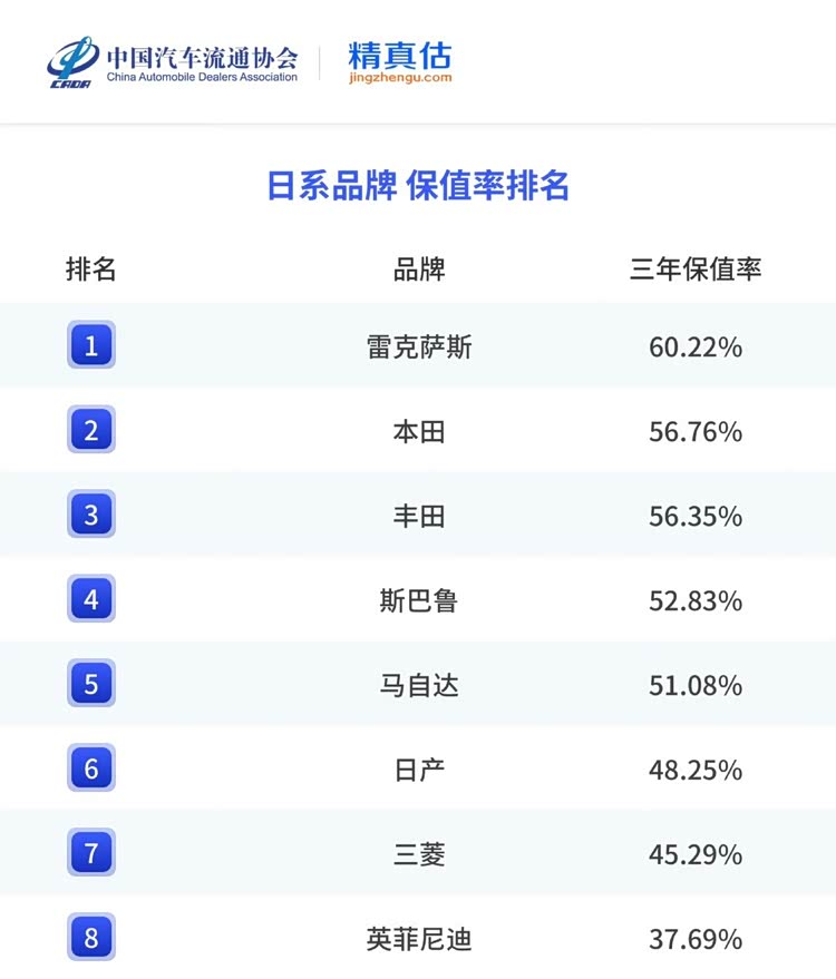 与此同时,日系车的保值表现同样抢眼。雷克萨斯以60.22%的三年保值率高居日系品牌榜首,也是除保时捷外唯一保值率突破60%的品牌。而在德系豪华阵营中,奔驰以58.50%的保值率排在了保时捷之后,宝马、大众、奥迪分别以52.68%、52.39%和50.19%的保值率形成第二梯队。当然,这些数据虽然看起来只有50%左右,但需要理解这是三年保值率,车辆在三年使用后仍能保持初始价值的一半以上,已经显示出强大的品牌力和产品可靠性。