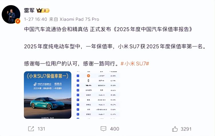 在新能源车保值率这边也是很有看头,比如说纯电动车的保值率榜单,前三名分别为小米SU7、问界M9、 理想MEGA(参数|询价),保值率分别达到了88.7%、85.2%和79.3%。为此,雷军还专门转发上述消息称:“感谢每一位用户的认可,感谢一路同行。”