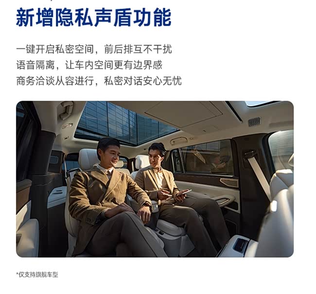 不仅照顾家庭用户,更注重商务出行的隐私需求。腾势N9 OTA升级隐私声盾功能,一键开启后,通过声波干涉原理,在前排与中排座椅间生成定向隔音声波屏障,有效隔绝前后排对话干扰,为商务洽谈、电话会议等需求提供安心的沟通环境。