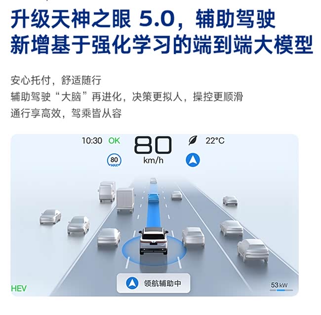在城市复杂的交通场景下,驾驶挑战层出不穷,如城中村人车混行等状况,即便打起十二分精神也难以完全避免突发风险。腾势N9本次OTA升级,辅助驾驶系统升级至天神之眼 5.0,搭载最新大模型版本,在全闭环端到端的基础上,新增强化学习能力,打造行业领先的辅助驾驶体验。