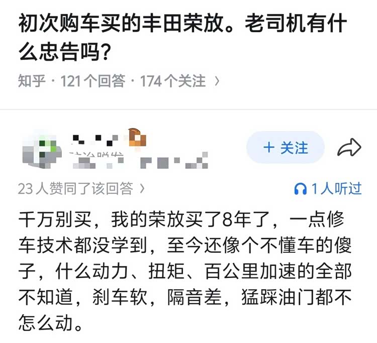 知乎上关于荣放有个很反常识的问答:有人问初次购车买的丰田荣放,老司机有什么忠告吗?