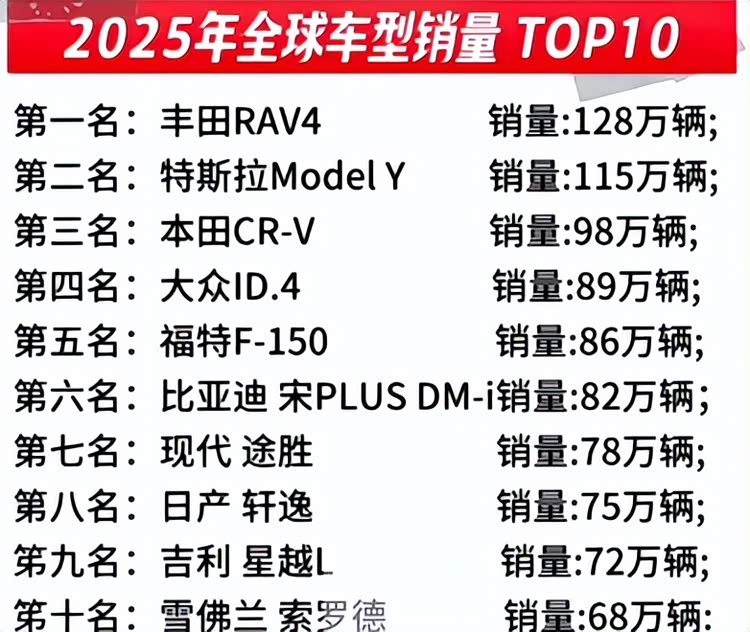 2025年全球单一车型SUV销量榜单出炉,丰田 荣放(参数|询价)以128万辆的成绩登顶全球第一,力压特斯拉Model Y的115万辆,把靠“颠覆者”标签吸粉的特斯拉,按在了销量榜单的第二名。