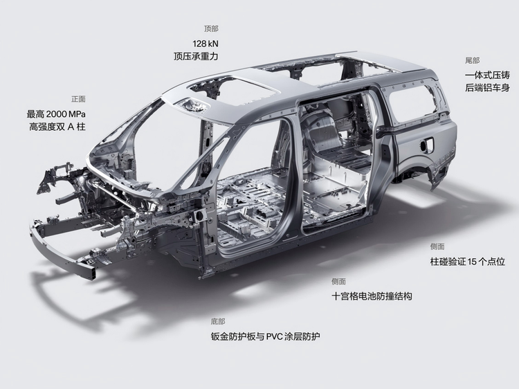 极氪009配备了7安全气囊,还有着720°全方位铠甲,应用了2000MPa超高强度的热成型钢以及一体式压铸铝合金车身,配合双A柱设计让它的车身刚性拉满,这也让极氪009成为全球唯一通过MPV连环追尾实验的车型,并且它还有实战战绩可查,极氪009与一台半挂碰撞后A柱近乎无损,甚至把半挂的钢板给切开了,太硬了!