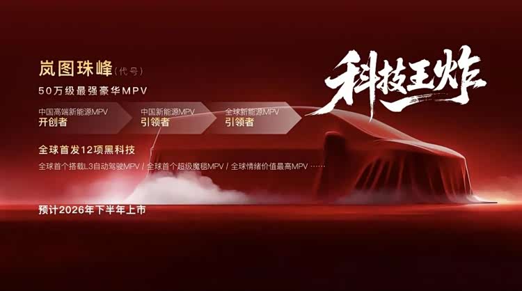 至于厂方此次公布的最后一款新车,则被描述为“50万元级最强豪华MPV”。从售价来看,这款代号为“岚图珠峰”的产品之定位显然还在梦想家之上。据介绍,该车将全球首发12项“黑科技”,并成为“全球首款L3自动驾驶MPV”,预计于2026年下半年上市。