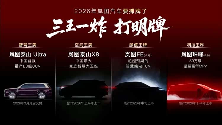 日前,岚图汽车对外发布了2026年产品计划。细看这份被描述为“三王一炸,打明牌”的高调宣言,该品牌在新一年度之勃勃雄心已昭然若揭:除了在大型SUV和高端MPV领域继续深化布局外,居然还有一款直接“硬刚”小米YU7的全新FUV车型,一起来先睹为快!