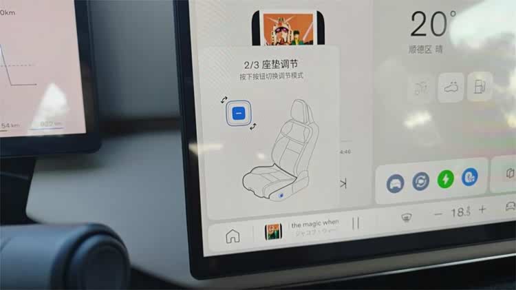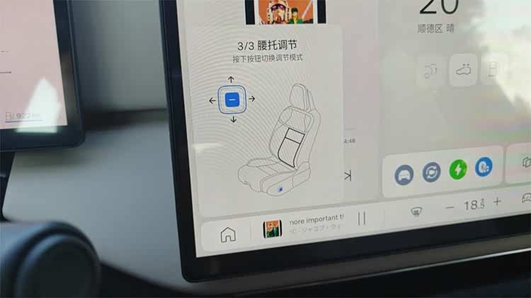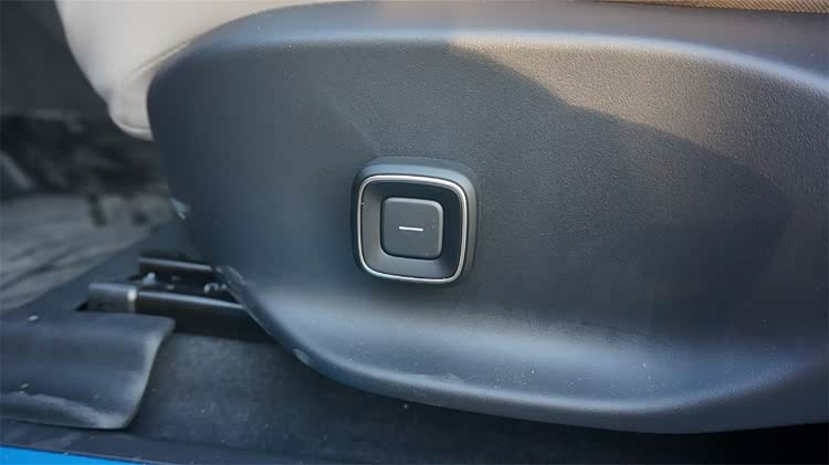 座椅的调节控件也设计得很有心思,一个简单而精巧的组件,就兼顾了座椅的所有调节维度。整个组件由中央的切换键,和外圈的摇杆组成。通过点击中央的切换键,就能切换座椅的位置、坐垫和腰托调节。外围的摇杆既能支持上下左右,也支持顺/逆时针的偏转,配合车机的指示也能很快上手。