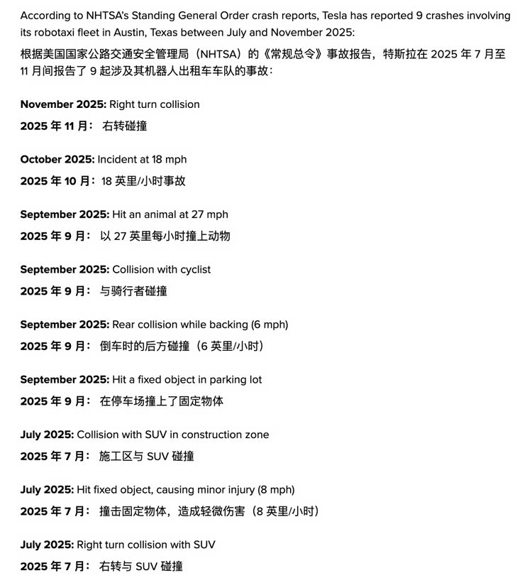 车家号·0浏览·2026-01-30 18:16 · 北京据IT之家信息,日前,美国国家公路交通安全管理局(NHTSA)数据显示,2025年7月至11月,特斯拉Robotaxi车队(自动驾驶出租车)在累计行驶约50万英里期间共报告9起低速碰撞事故,平均每5.5万英里发生一次(事故),事故率是人类司机的9倍。相比之下,美国人类司机平均每20万至50万英里才发生一次事故。