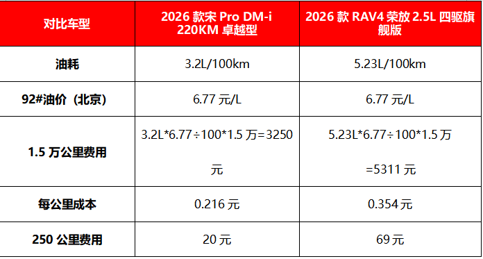 油耗作为出行成本的重要组成部分,对于注重精打细算的家庭而言,意义重大。2026款宋Pro DM-i表现出色,其NEDC百公里亏电油耗低至3.2L。以当前92号汽油油价6.77元/升计算,每公里出行成本约仅0.216元。即使完全用油的情况下,若一年行驶1.5万公里,油费总计约3250元。相较之下,2026款RAV4荣放综合油耗为5.23L/100km,同样行驶1.5万公里,油费需5311元。由此可见,宋Pro DM-i一年能节省2061多元,足可用于为孩子准备丰厚“压岁钱”或为父母选购贴心礼物。