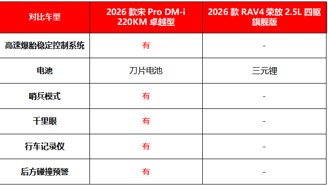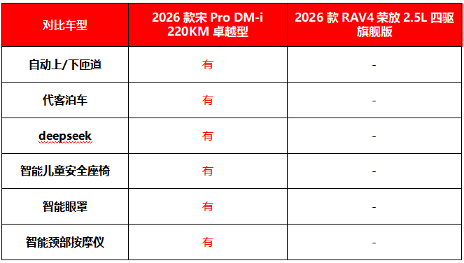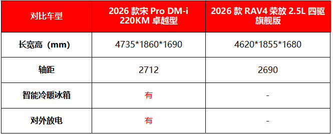 春节临近,在外工作的人将踏上返乡旅程。面对高铁票一票难求的窘境,买辆属于自己的座驾,能更从容地踏上回家路。但对于计划在春节前购车的准车主而言,选一款能经受长途返乡考验的车并不容易,续航、油耗、安全、智能以及舒适便利性等问题,都得全方位考量。在紧凑级SUV市场,2026款宋Pro DM-i和2026款RAV4荣放热度颇高,接下来,我们就从多个维度对2026款宋Pro DM-i 220KM卓越型和2026款RAV4荣放2.5L四驱旗舰版进行深度对比。