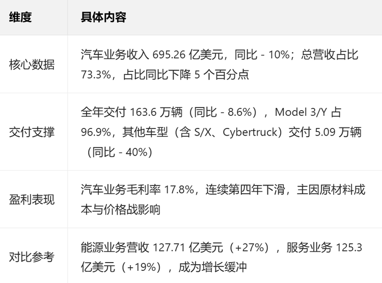 汽车销量与营收的双重下滑,是特斯拉2025年业绩困境的核心原因,直接动摇了公司的业务基本盘。长期以来,汽车业务始终是特斯拉营收和利润的主要贡献来源,占比常年维持在70%以上,而2025年这一核心板块的表现却陷入低迷。