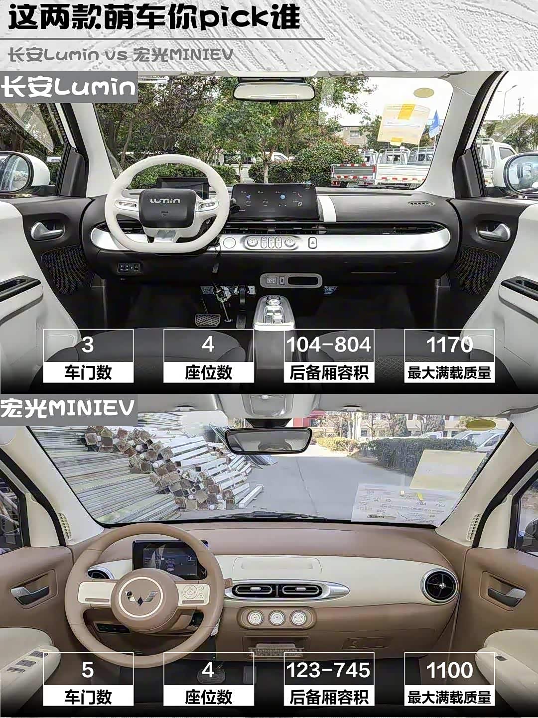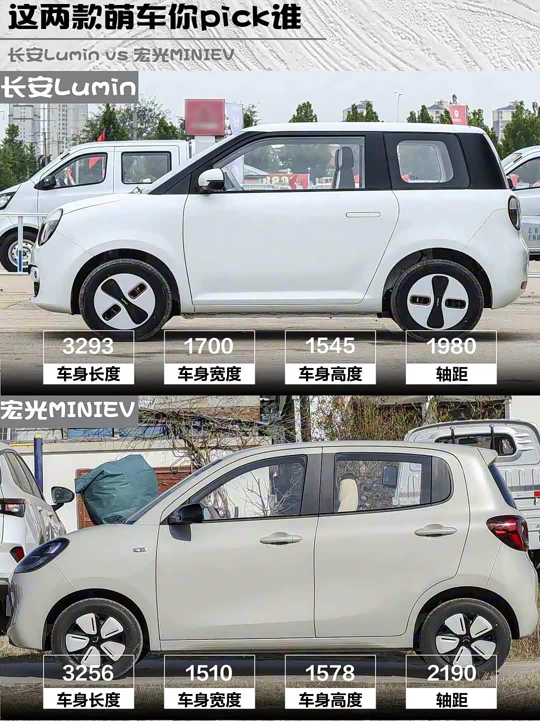 长安Lumin酷爱米色像颗移动的奶糖🍬,圆润车身+隐藏门把手高级感拉满,前大灯带流水效果超吸睛!宏光MINIEV则是经典方盒子造型,双拼色车身自带改装潜力,四门版比例比老款协调很多。个人觉得Lumin更适合精致路线,MINIEV玩改装更出片~