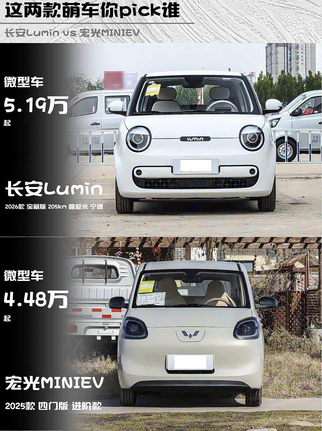最近在纠结5万级纯电代步车选谁?深度体验长安Lumin 2026款宝藏版和 宏光MINIEV(参数|询价) 2025款四门进阶款后,掏心窝子分享对比干货!🔥