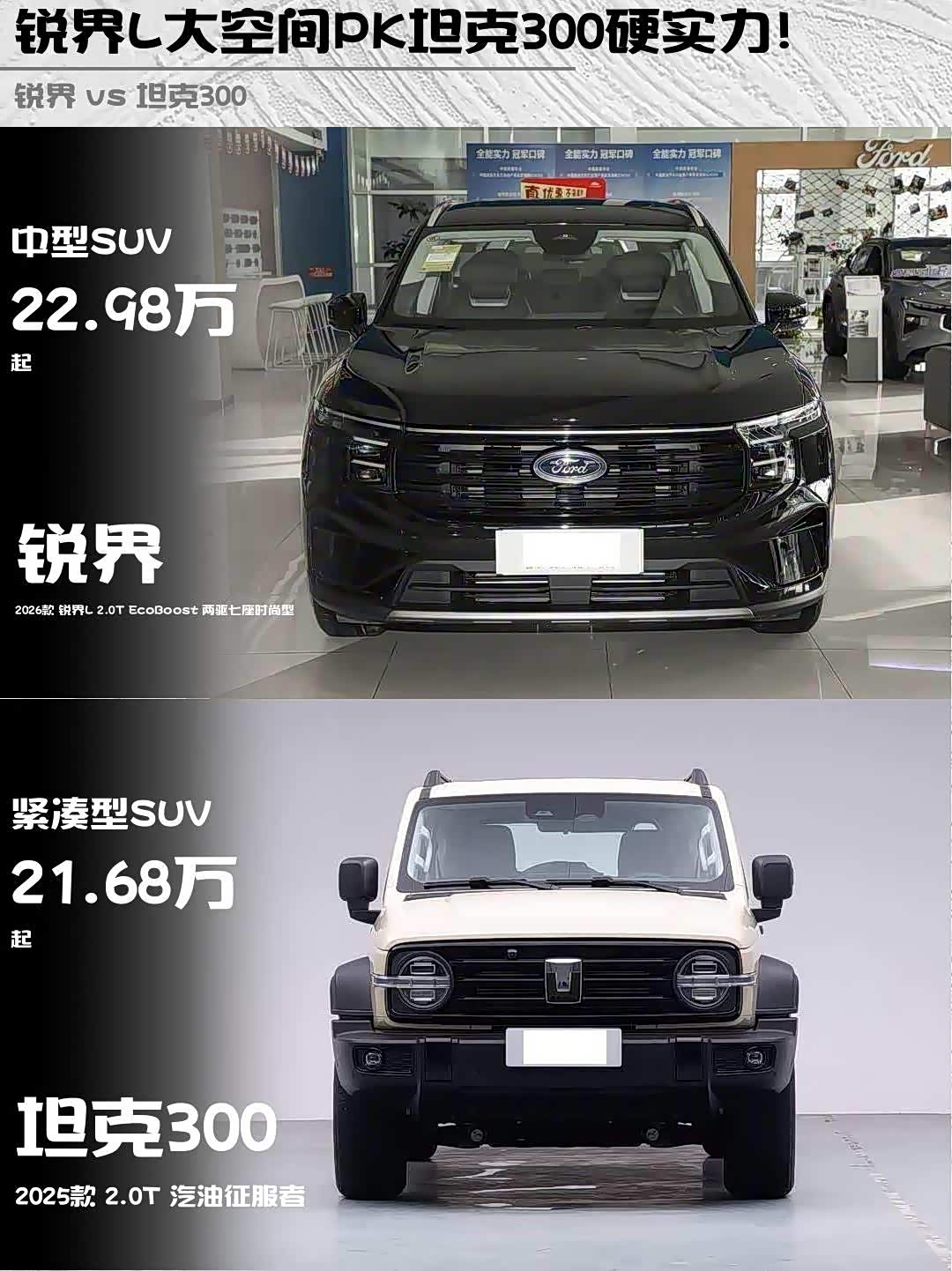 车家号·0浏览·2026-01-31 08:44 · 北京最近身边好几个朋友都在纠结选家用SUV还是硬派越野,作为开过2026款锐界L 2.0T两驱七座时尚型和2025款 坦克300(参数|询价)汽油征服者的老司机,必须来波硬核对比!🔥