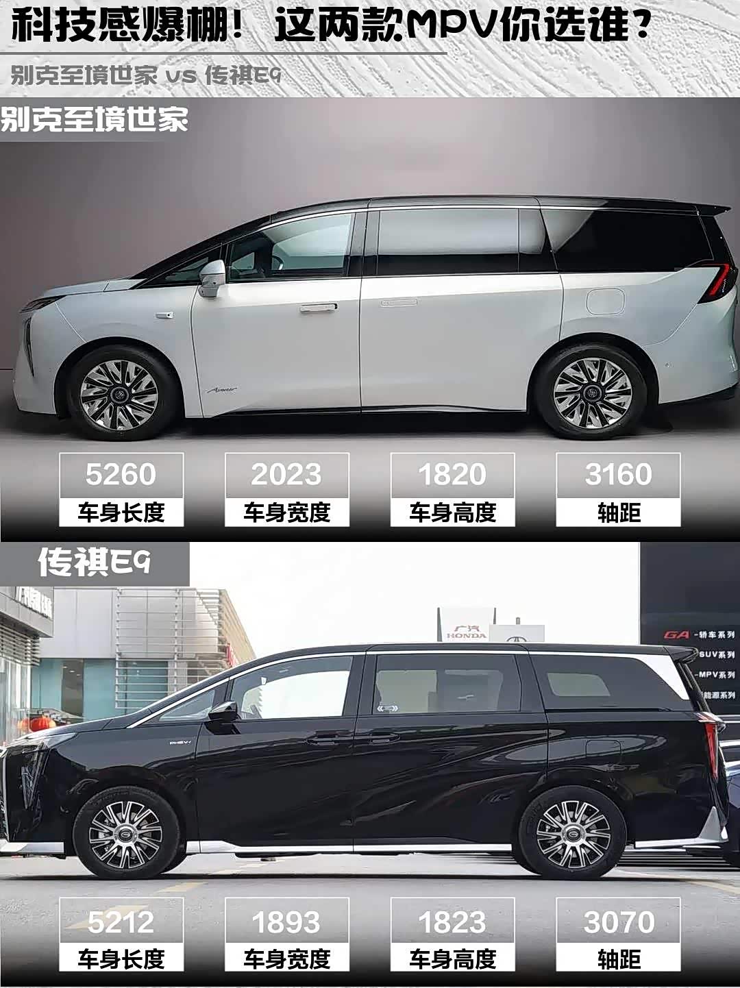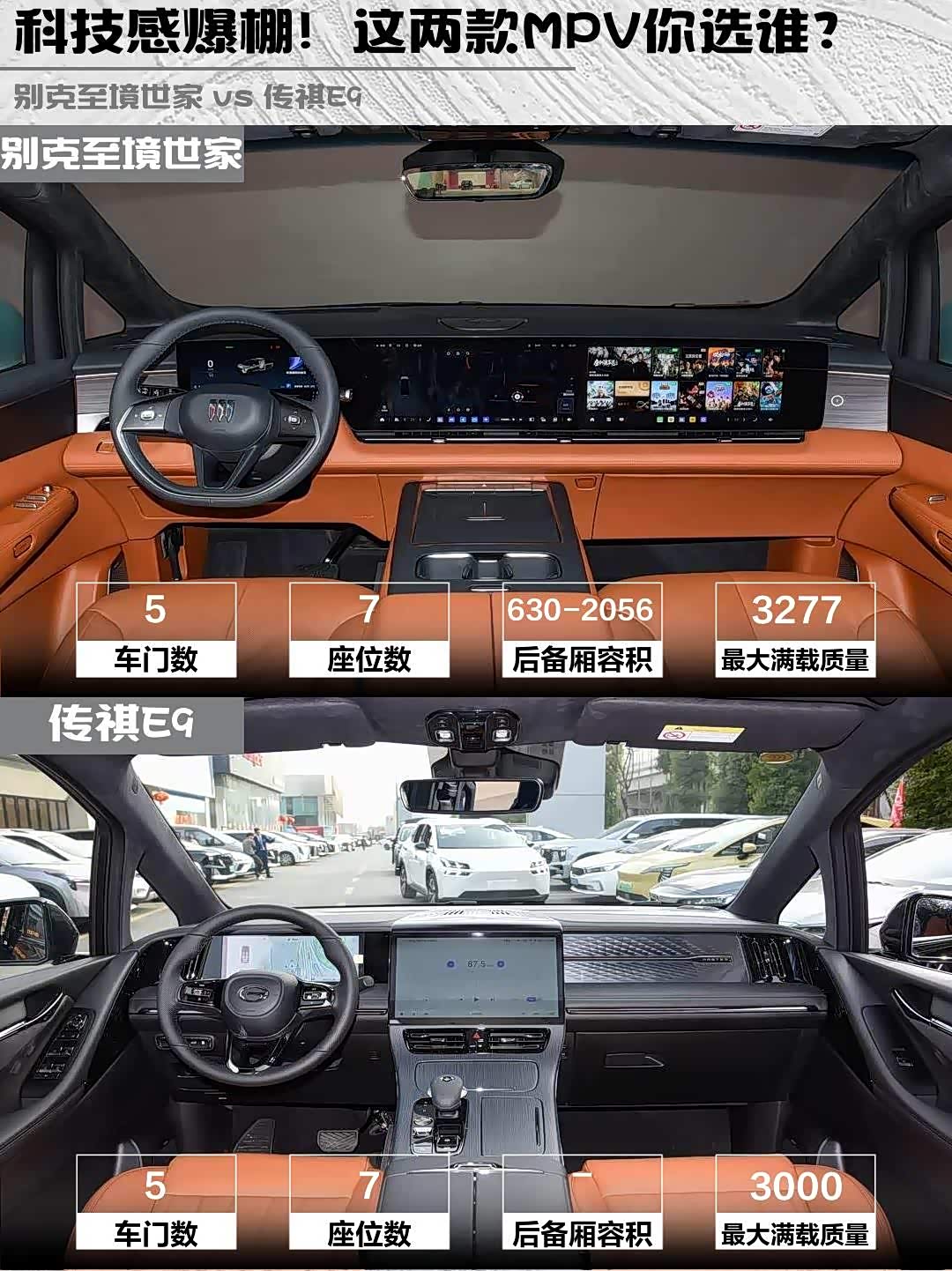 两车都是7座但细节差很大!别克轴距3160mm,第三排成年人坐也不憋屈,二排腿托+按摩堪比头等舱🛋️。传祺E9二排零重力座椅超舒服,但后备箱比别克小一圈,婴儿车+行李箱党要三思🧳