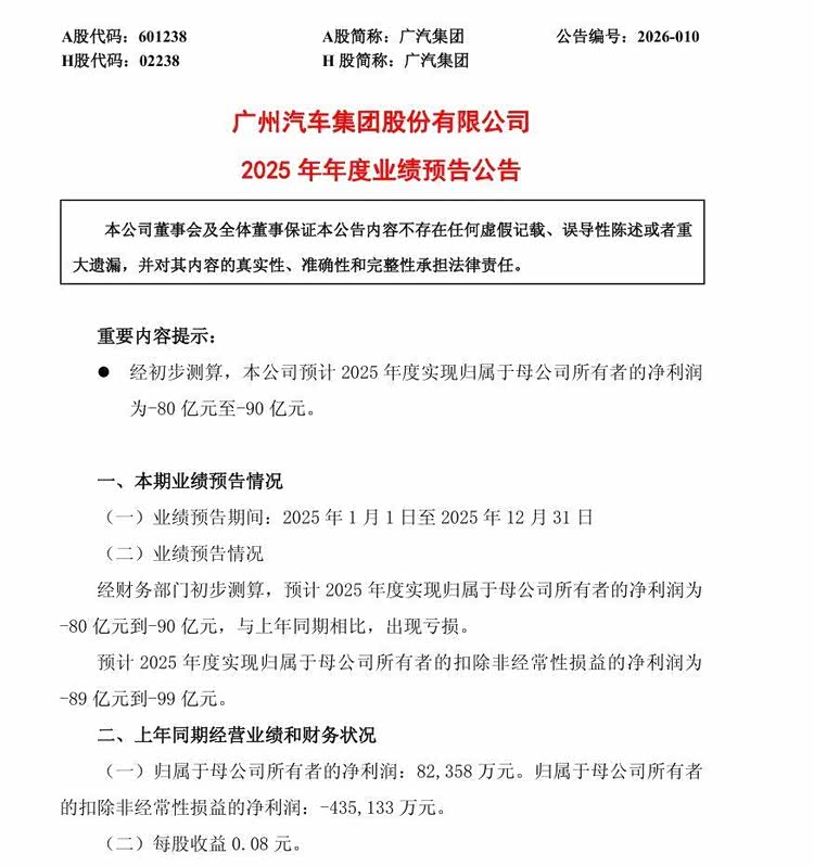 1月30日下午,广汽集团发布2025年年度业绩预告。