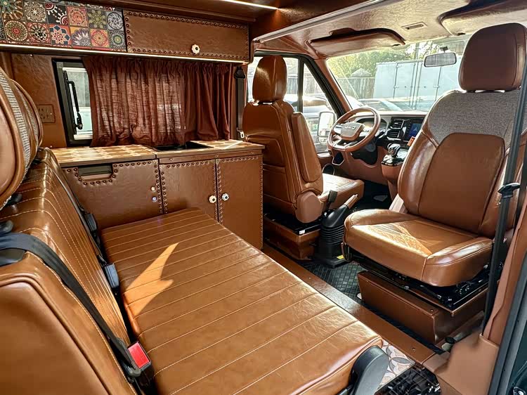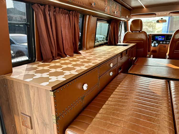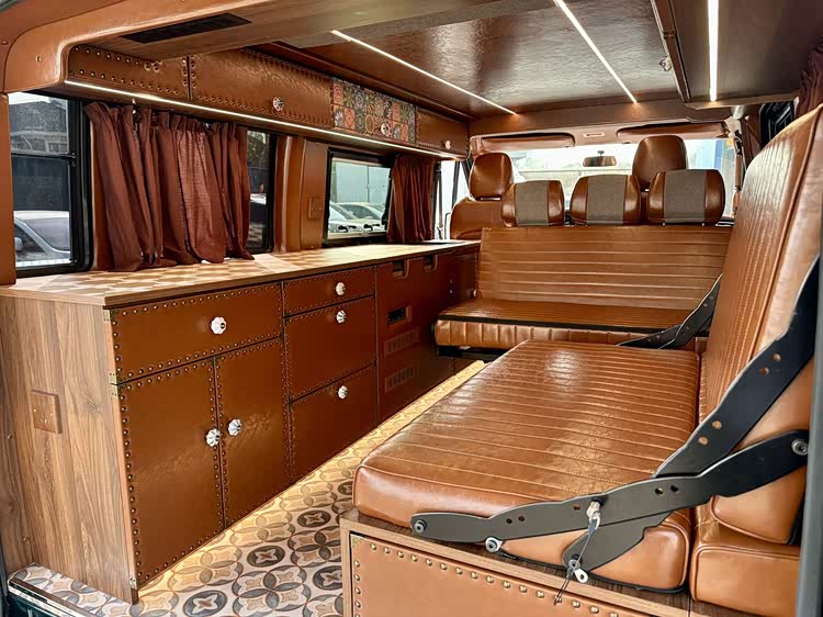 座椅与门板采用油蜡皮包裹,触感温润且耐老化,搭配美式复古印花地板、原木饰面侧柜与麂皮顶棚,营造出自然温馨的旅居氛围。驾驶舱内机械指针式复古仪表盘充满工业风,隐藏其后的智能车机系统实现科技与复古的巧妙平衡;车顶复古铜制吊灯与单色环境氛围灯,夜晚点亮时更添静谧惬意的露营氛围。