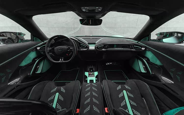 侧面造型方面,车身采用了绿黑渐变色设计,车身覆盖件大面积使用了碳纤维材质,能够起到降低车重的目的;前后翼子板位置都有导流槽,侧裙部分还配备有空气动力学套件,风格更显夸张;前轮毂尺寸为21英寸,后轮毂尺寸则是22英寸,搭配有大尺寸碳陶瓷刹车盘以及车身同色卡钳。