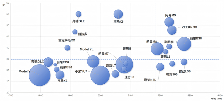 气泡大小:上险数、横轴:车长(mm)、纵轴:TP加权平均