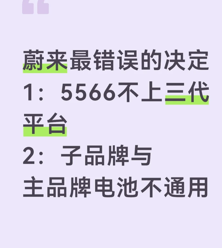 在新能源汽车市场竞争日趋白热化的当下,每一个战略决策都可能影响品牌的市场走向。近期,蔚来汽车的两项决策引发了行业和车主群体的广泛讨论,甚至被不少网友直言是“最错误的决定”——旗下车型5566未搭载三代平台,以及子品牌与主品牌电池不通用。这两大争议点,不仅戳中了部分消费者的痛点,也让外界对蔚来的产品布局逻辑产生了疑问。