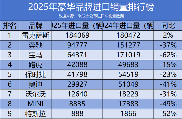 2025年豪华品牌进口销量排行榜正式出炉,数据显示,全年豪华进口车市场格局迎来剧烈洗牌,雷克萨斯凭借稳健表现登顶,而奔驰、宝马、奥迪等德系豪华品牌则遭遇大幅下滑,整体市场呈现“一强多弱”的分化态势。