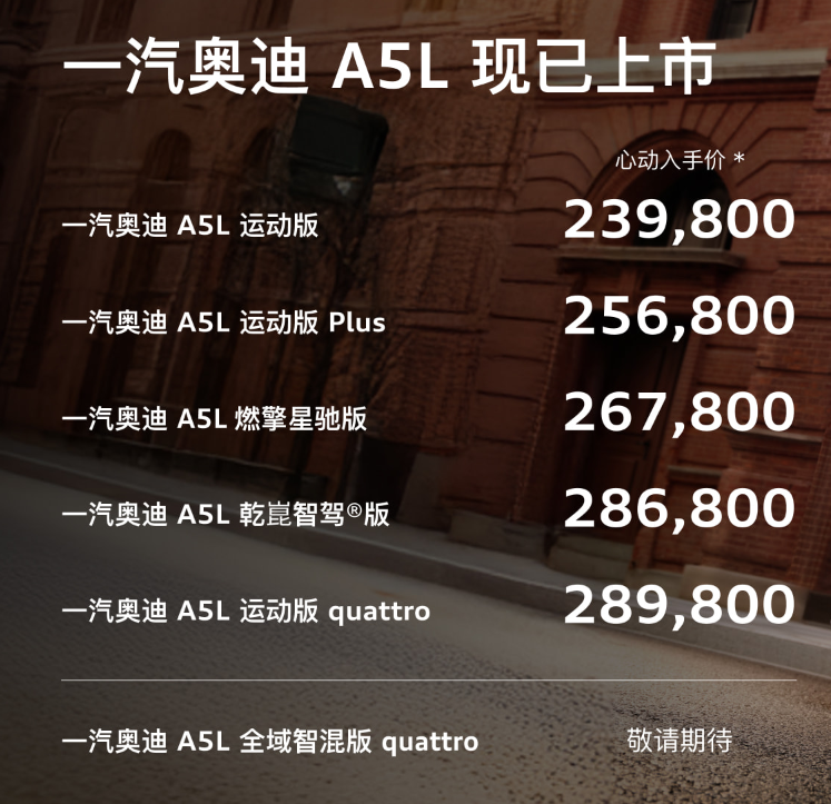在豪华中型轿车市场不断细分之际,一汽奥迪于1月30日正式推出 2026款奥迪A5L 2.0T 燃擎星驰版。作为A5L家族的新成员,它以运动化定位与智能科技融合,主打运动与家用兼备的三厢车造型。新车厂商指导价为 28.58万元,目前经销商报价 26.78万元起,相比同级竞品,入门门槛相对友好。
