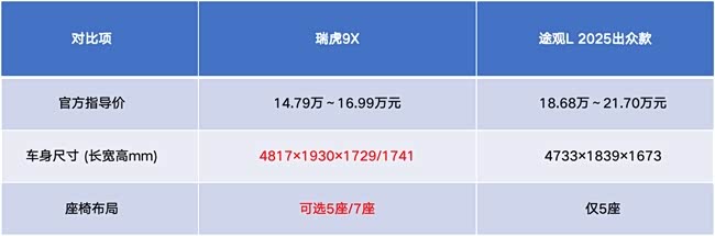 对比而言,途观L作为5座SUV,空间表现规整够用,但面对多成员家庭“三代同堂”一起出行的典型场景,它的先天结构便决定了局限性。换言之,从乘坐人数到装载弹性,瑞虎9X在空间实用性上,提供了比途观L更全面、更灵活的解决方案,避免了春节出行坐不下或装不了的尴尬。