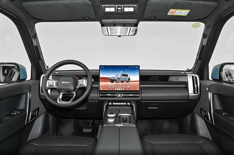 进入车内,iCAR V27的内饰设计整体延续了外观的硬朗风格,但同时增加了对科技感的提升。中控台区域配有一块悬浮式设计的中控大屏,下方保留了包括空调控制、驾驶模式选择在内的实体按键和旋钮,对于行车中的盲操较为友好和实用。用料方面,车内采用了双拼色的面料包覆,并在门板、扶手箱等常接触区域使用了软性材料包覆,搭配上较多的镀铬饰条装饰,让车内的精致感也有一定提升。