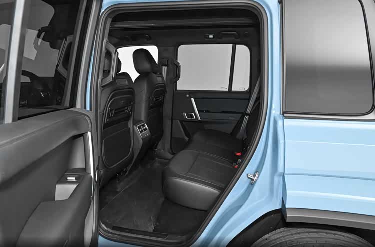 iCAR V27作为一台拥有硬派越野视觉风格的SUV,其设计核心是方盒子的整体造型。车头采用了半封闭式格栅,保留了扁平的进气口,并在内部配有粗壮的黑色饰板装饰,加上熏黑处理的环形大灯组,营造出坚实且富有力量感的前脸形象。车身侧面线条平直,轮眉和侧裙都配有黑色饰板,配上黑色的轮毂设计,也为整车带来了一些野性魅力。车尾部分采用了垂直布局的熏黑尾灯,并采用了侧开式尾门以及外挂的全尺寸备胎或“小书包”储物箱,这些元素均向经典的硬派越野车风格致敬。
