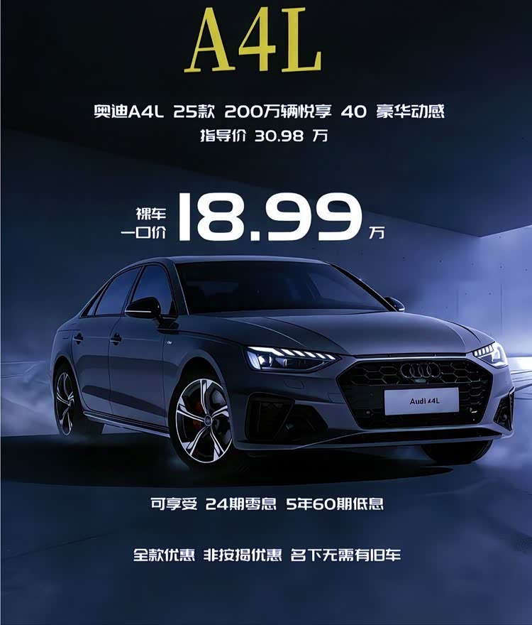 当然这个奥迪A4L降价海报并非来自奥迪官方,大概率是极个别第三方经销商给出的限时价格,至于有没有套路,可以拿奥迪官方售价进行对比,奥迪对200万辆悦享版 40 TFSI 时尚动感型,裸车价从28.98万下调到22.89万,4S店肯定还有优惠,裸车价应该能做到22万,加上2026款很快到来,汽车城的一些卖家肯定着急清仓2025款,所以18.99万有一定可信度。