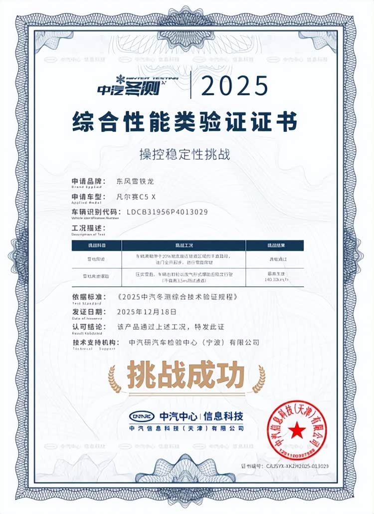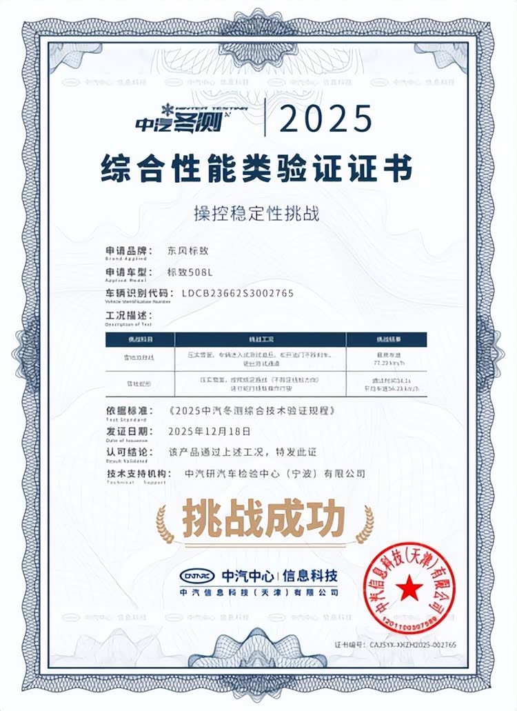 产品硬实力是逆市突围的核心底气。依托法系百年技术积淀,东风标致与东风雪铁龙始终聚焦安全、操控等核心优势,持续提升产品品质,旗下车型的卓越性能在极端环境中得到充分验证。在中汽中心“2025极寒驾控安全主题技术验证”中,东风雪铁龙凡尔赛C5 X与东风标致508L双双斩获“操控稳定性挑战”验证证书,其中凡尔赛C5 X的140km/h雪地高速爆胎稳控表现、满载雪地爬坡能力,以及东风标致508L的精准雪地操控,均展现了双品牌扎实的产品功底。这一权威认证不仅获得央视等主流媒体报道,更增强了市场对双品牌产品的信任度,成为消费者选择的重要理由。