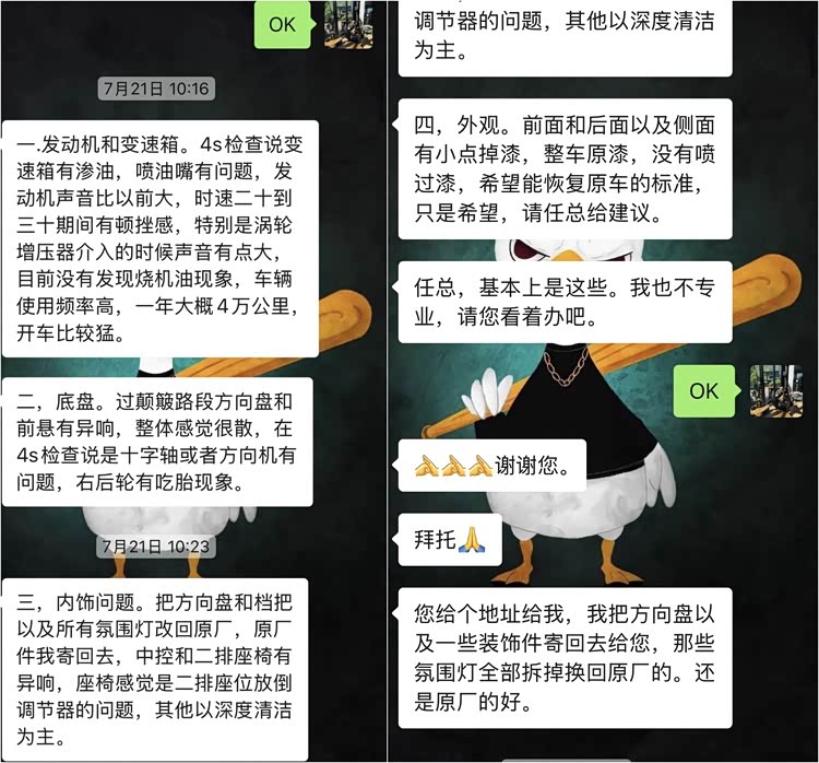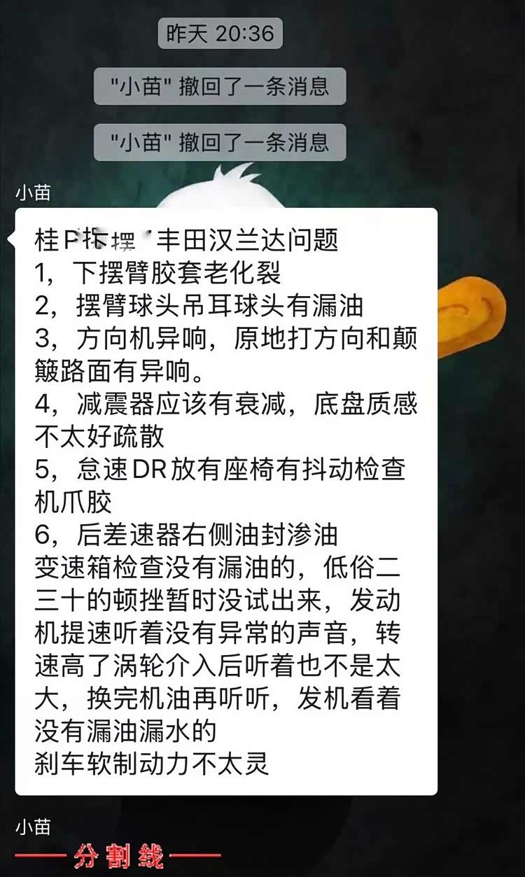 这是车主整理的车况问题与需求:发动机声音太大、变速箱漏油、底盘松散、方向机异响、吃胎等等。