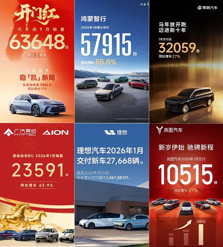鸿蒙智行1月销量5.79万台,同比增长65.5%,保持高速增长态势。手持问界M7、问界M8、智界R7和享界S9T等明星车,鸿蒙智行在应对这场退坡大考时,更具抵抗能力。其将在春节后迎来智界MPV、问界M6等全新车型的入市,可以预见,这个2026年鸿蒙智行仍然是快速向上奔跑的一年。