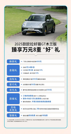 2025款 欧拉好猫GT(参数|询价)木兰版同样享有以旧换新补贴最高4000元,并支持两年零利率金融方案。该车型在动力和操控上与标准版欧拉好猫存在差异,电机功率及悬架调校更加注重驾驶响应。结合金融支持政策,用户在购车时可减轻资金压力,同时获得更高性能配置和针对性能优化的续航表现。