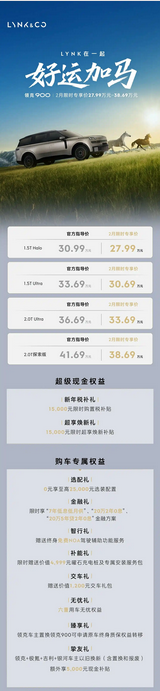 日前,我们从领克汽车官方或许, 领克900(参数|询价)在2月份推出限时专享价,售价区间为27.99-38.69万元。此次价格调整包括1.5万元购置税补贴以及1.5万元换新补贴,同时提供高达2.5万元的选装配置零成本选择。金融方案方面,支持7年低息或低月供,以及两年0利率购车模式。针对以旧换新用户,领克、极氪、吉利、银河车主可获得额外5000元现金补贴,降低购车门槛。此次定价策略和补贴方案为潜在购车用户提供了更多成本规划空间,同时在配置选择上保持灵活性。