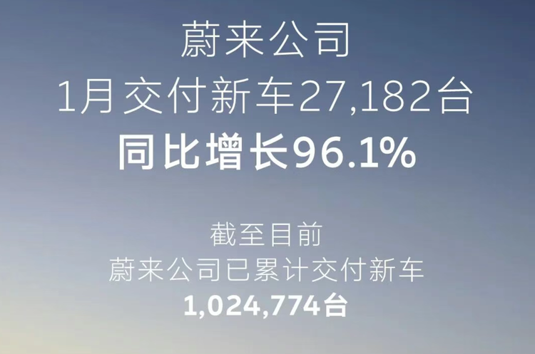 1月蔚来公司共计交付新车27182辆,同比大幅增长96.1%。更为重要的是,公司历史累计交付量于本月正式突破100万辆,达到1024774辆。