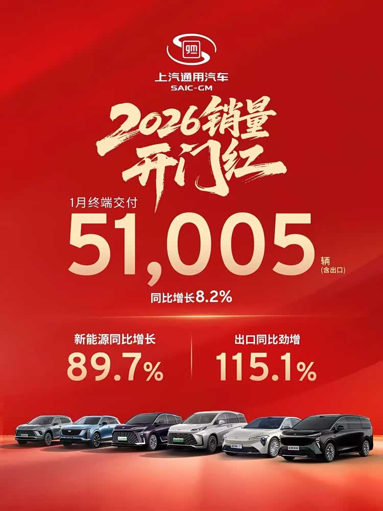 上汽通用也迎来了2026年“开门红”,1月终端交付51005辆,同比增长8.2%。其中新能源车型交付同比增长89.7%,海外出口增长115.1%,其结构性增长较为亮眼。