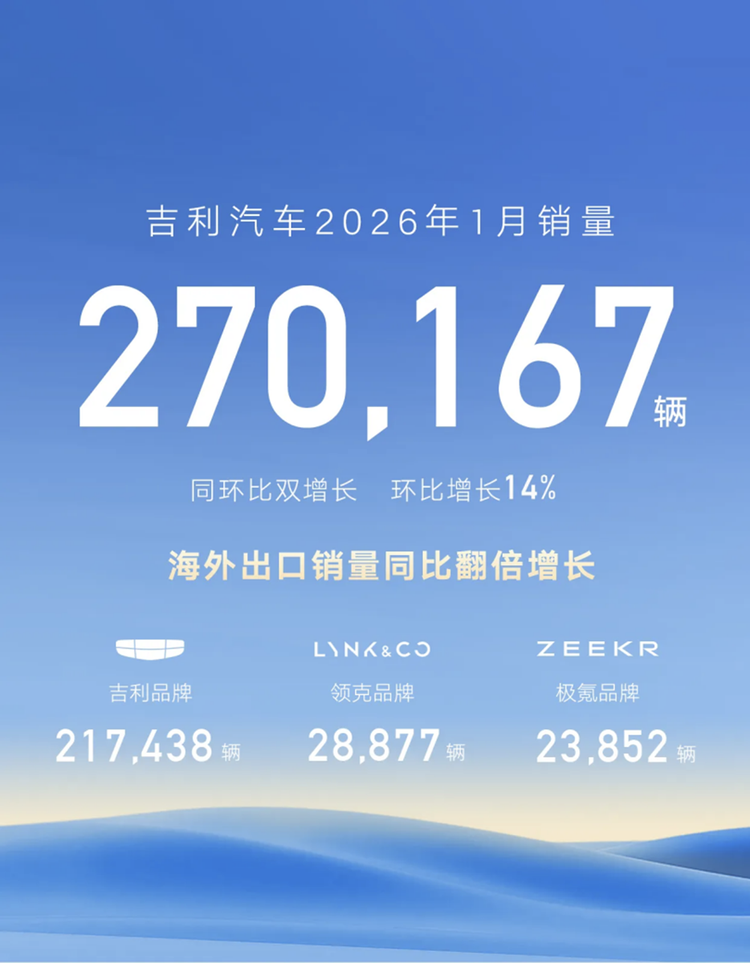 吉利汽车(含领克、极氪)1月销量 270167 辆