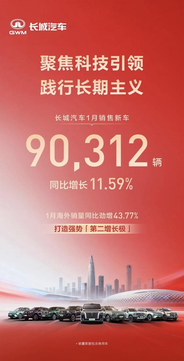 长城汽车(含哈弗、魏牌、坦克、欧拉长城炮)1月销量90312辆