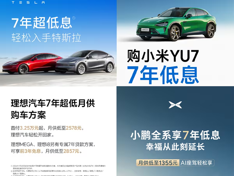 这套“组合拳”花样繁多。例如,特斯拉在1月初推出了“7年超低息”的金融政策。如果你贷款10万元,选择这种方案,一年的利息大约只需要500元。很快,小米、理想和小鹏等品牌也纷纷推出了类似的长期低息分期方案。对很多年轻家庭来说,降低月供压力比单纯的车价优惠有时更具吸引力。