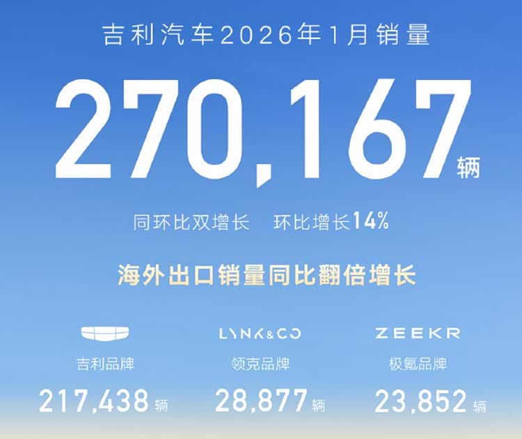 吉利汽车销量表现很抢眼,1月销量达到270167辆,环比增长14%。这其中,新能源销量达到12.4万辆,在传统国产大厂中,吉利新能源转型速度一直很快,其中,吉利银河品牌1月销量达到82990辆,此外,领克品牌、极氪品牌的销量都很给力,可以说,吉利在新能源车市场找到了爆款秘籍。