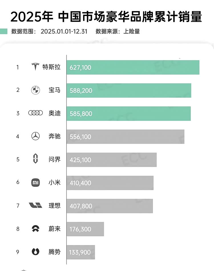 这是2025年中国汽车市场豪华品牌累计销量排行榜,真是不看不知道,一看吓一跳,特斯拉卖了62.71万台,唯一突破60万台的豪华品牌。bba均卖了50多万台,其中奔驰最低,为55.61万台。问界小米理想三个国产品牌均突破40万台,蔚来和腾势均突破十万台。
