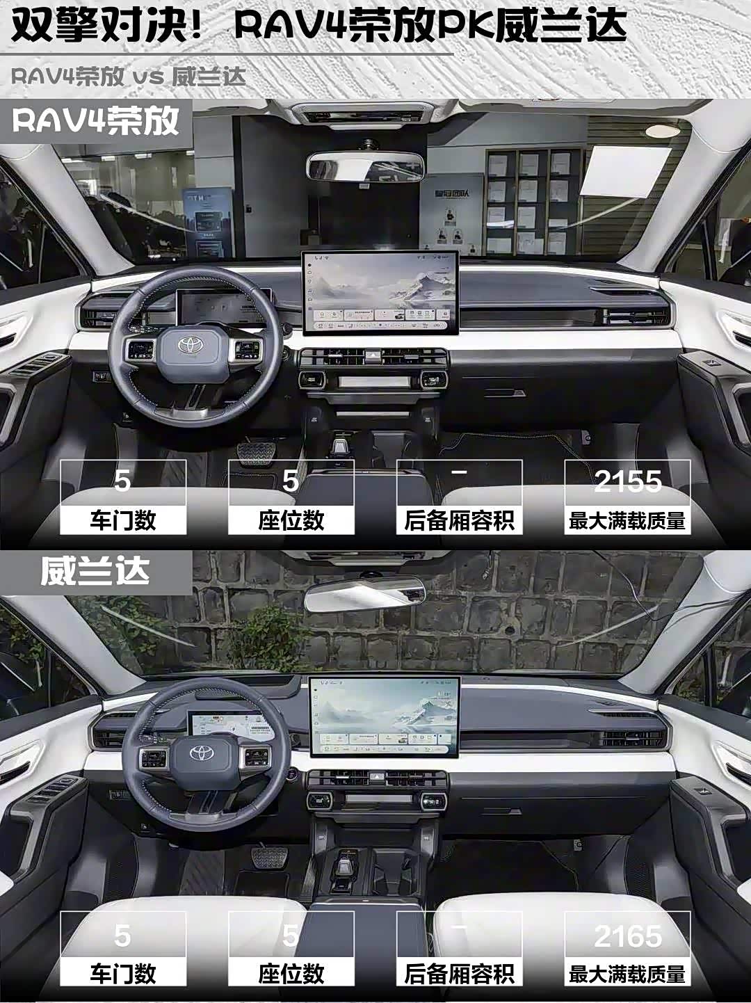- 内饰方面,RAV4塑料感强但实体按键盲操顺手,威兰达中控倾斜设计更人性化