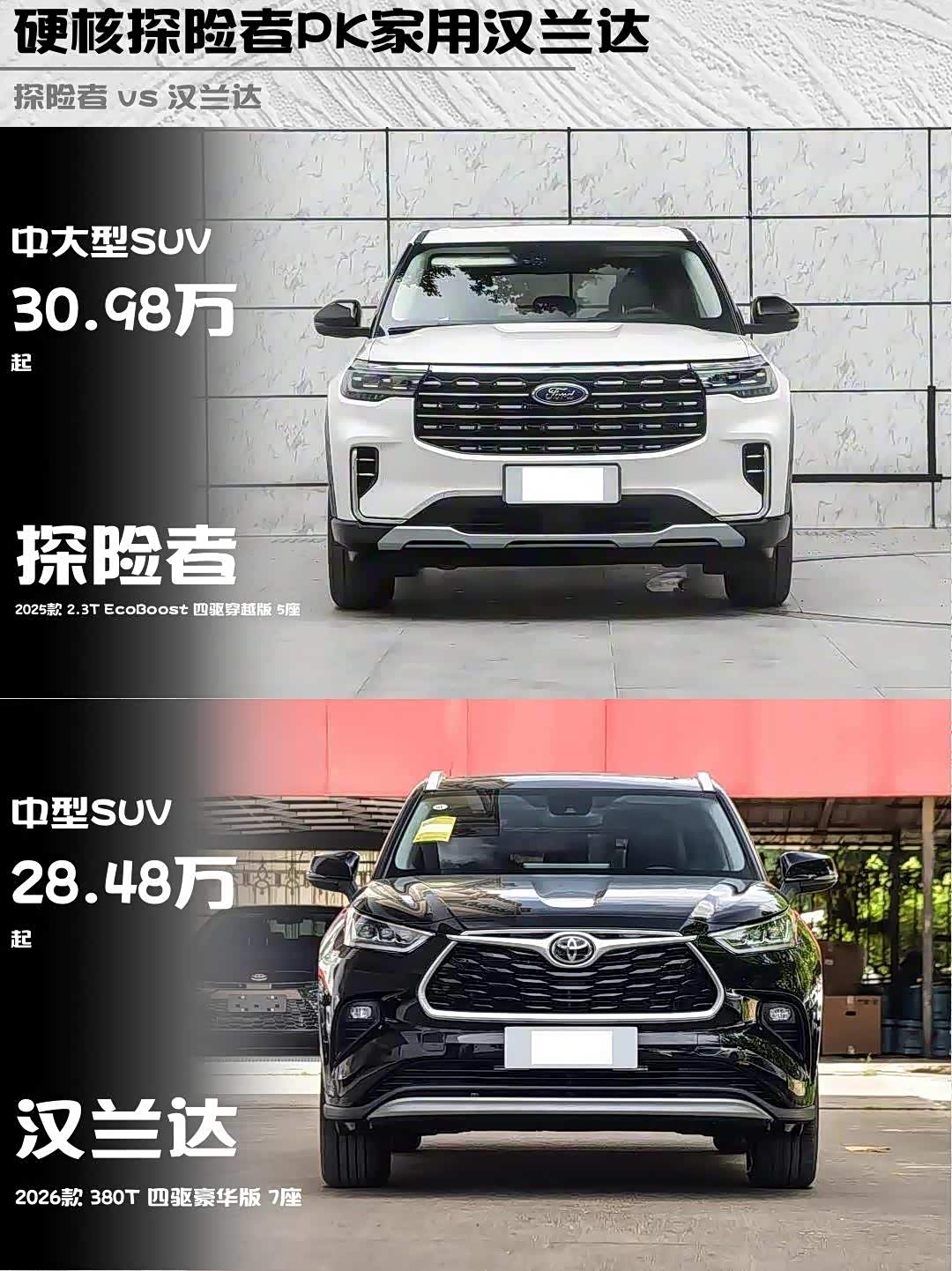 最近身边不少朋友在纠结选SUV,尤其是探险者和 汉兰达(参数|询价)这两款热门车型🔥 作为深度体验过2025款探险者2.3T四驱穿越版和2026款汉兰达380T四驱豪华版的老司机,必须来波硬核对比!