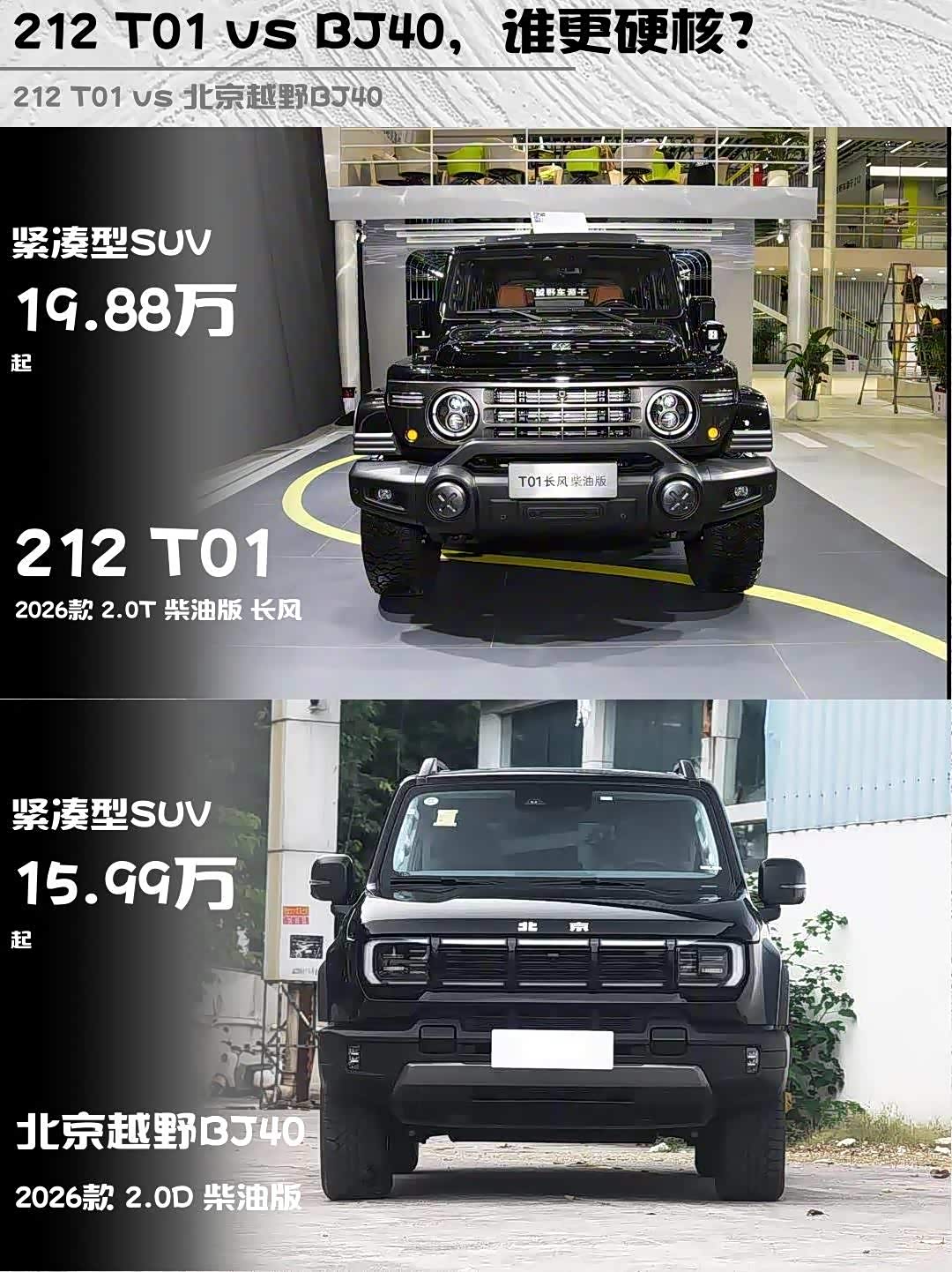 最近后台好多兄弟在问硬派越野怎么选,尤其是212 T01 2026款 2.0T柴油版长风和北京越野BJ40 2026款 2.0D柴油版这两台车,作为深度体验过两台车的越野老炮,今天直接上干货对比!🔥