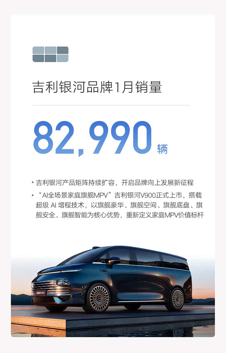 细分品牌上,吉利品牌1月销量217438辆;领克品牌售出28877辆;极氪品牌表现稳健,销量稳定在2万辆以上,达23852辆。