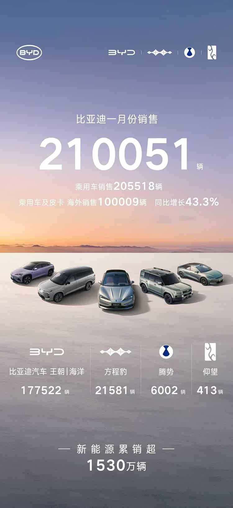 比亚迪在1月销量为210051辆,其中乘用车销量205518辆,而乘用车及皮卡海外销量达10万辆,同比增长43.3%。细分来看,王朝与海洋网合计销量17.75万辆,方程豹销量21581辆,腾势销量6002辆,仰望销量413辆。目前比亚迪出口销量进一步逼近奇瑞的出口销量,差距不足20%,在今年有望登顶中国品牌出口单月冠军。