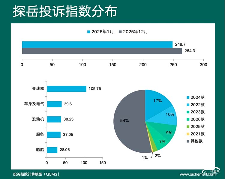 汽车质量投诉点评:本月探岳投诉指数无太大波动,投诉仍集中在变速器层面,以其他款车型为主。该问题基本是大众车型的通病,采用双离合变速箱的车型在使用6年左右后极易出现机电单元变速箱故障,因此时车辆已经出保,高额的维修费用只能自行承担,进而引发车主投诉不断。此外,本月2024款探岳还出现少量轮胎开裂投诉,轮胎开裂在大众多款车型上也曾出现过,和采购的轮胎批次有关。