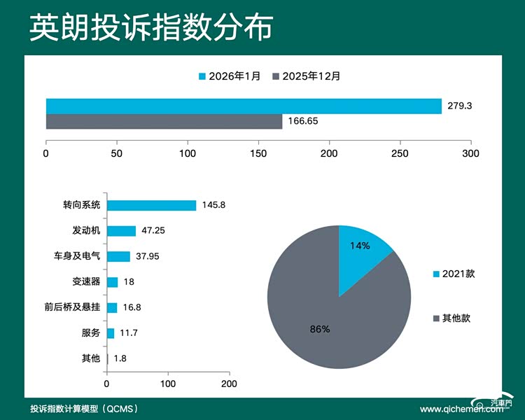 汽车质量投诉点评:本月英朗投诉指数在短暂回撤后再次爆发,环比上涨67.6%,转向卡滞异响仍是车主投诉的焦点,该问题因集中出现在2016款~2019款车型上,因车型较老早已出保且厂商曾进行过召回,致使问题哪怕没有彻底解决也维权艰难。而且转向卡滞异响问题在上汽通用多款车型上均存在,已经成为多款车型的通病。